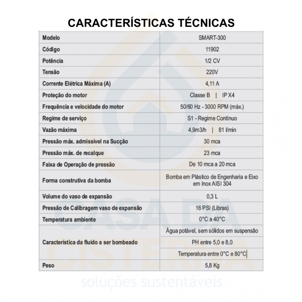 • Bomba em plástico de engenharia, ideal para regiões em que a água ataca o Aço Inox