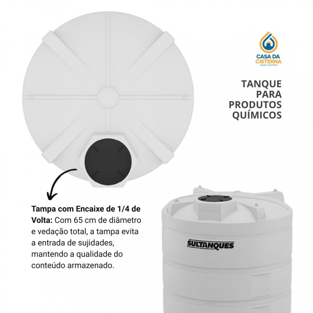 - Tampa com Encaixe de 1/4 de Volta: Com 65 cm de diâmetro e vedação total, a tampa impede a entrada de sujeiras e contaminações, mantendo a qualidade do conteúdo.