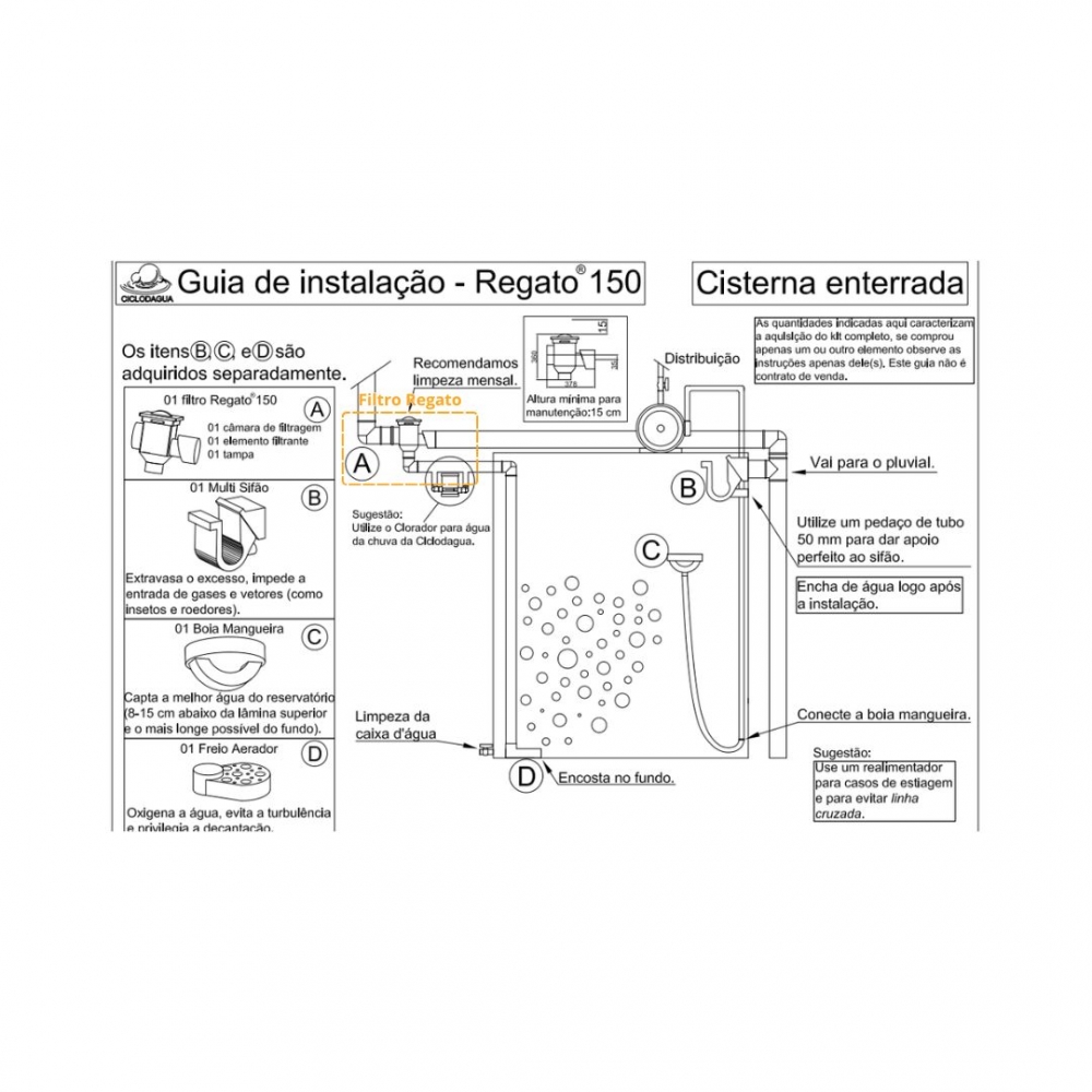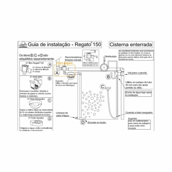 O Filtro Regato 100 para água da chuva foi projetado para telhados de até 100 m². Filtragem para usos gerais atingindo balneabilidade excelente de acordo com a resolução CONAMA. 274/2000. Possui dimensões reduzidas a fim de que a instalação seja possível de várias formas, como por exemplo: enterrado, fixado em paredes, lajes, andaimes, treliças, dentro de cisternas, aéreo ou mesmo abaixo do nível da rua. A exclusiva válvula de retenção, localizada no expurgo, impede o refluxo da água bem como a entrada de vetores mesmo que instalado abaixo do nível da rua ou em águas furtadas.